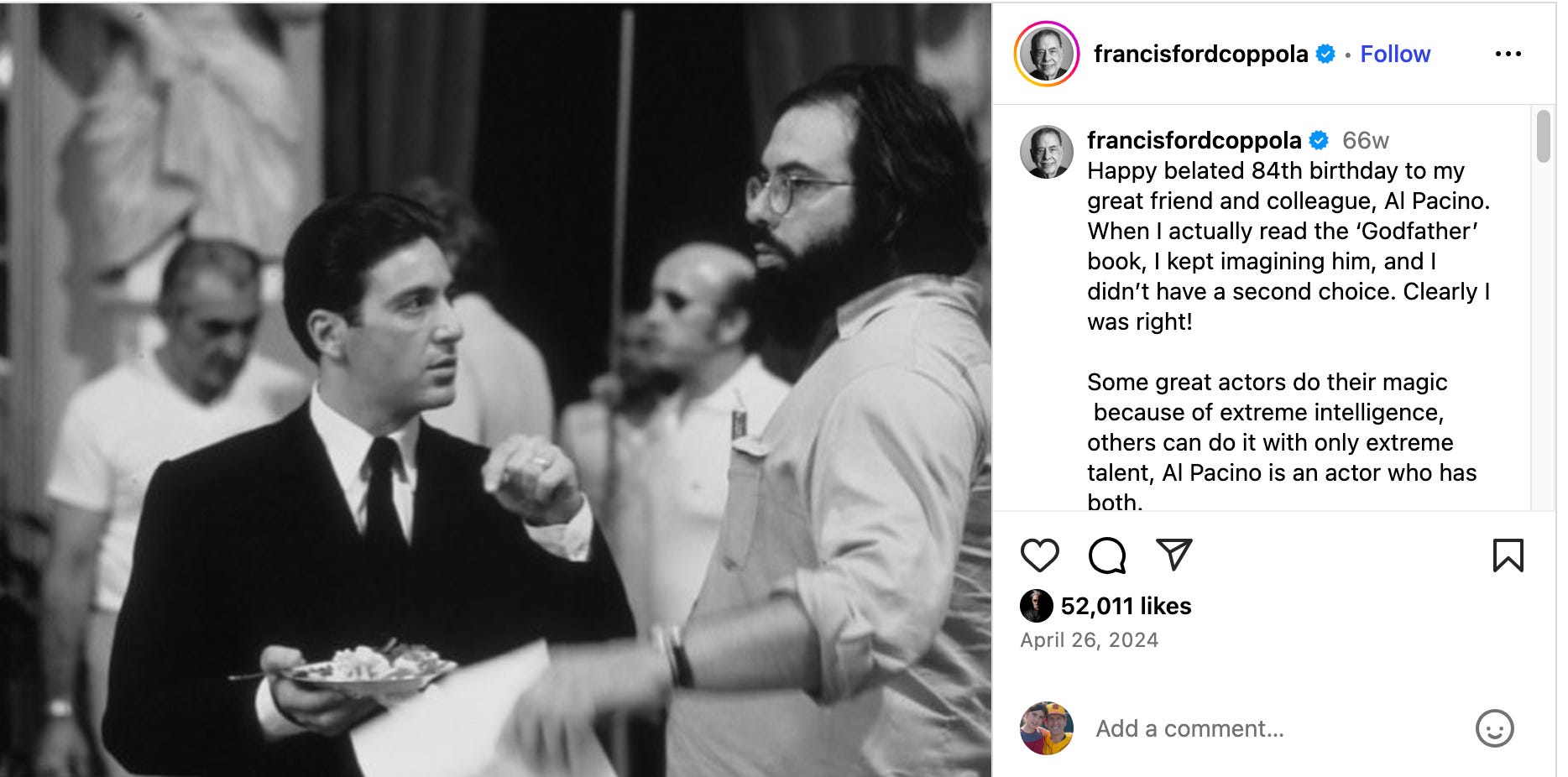 It’s clear Coppola loved seeing Pacino succeed; The Godfather, Scarface, Carlito’s Way, and more. He remained a supporter, a friend, wishing him well.