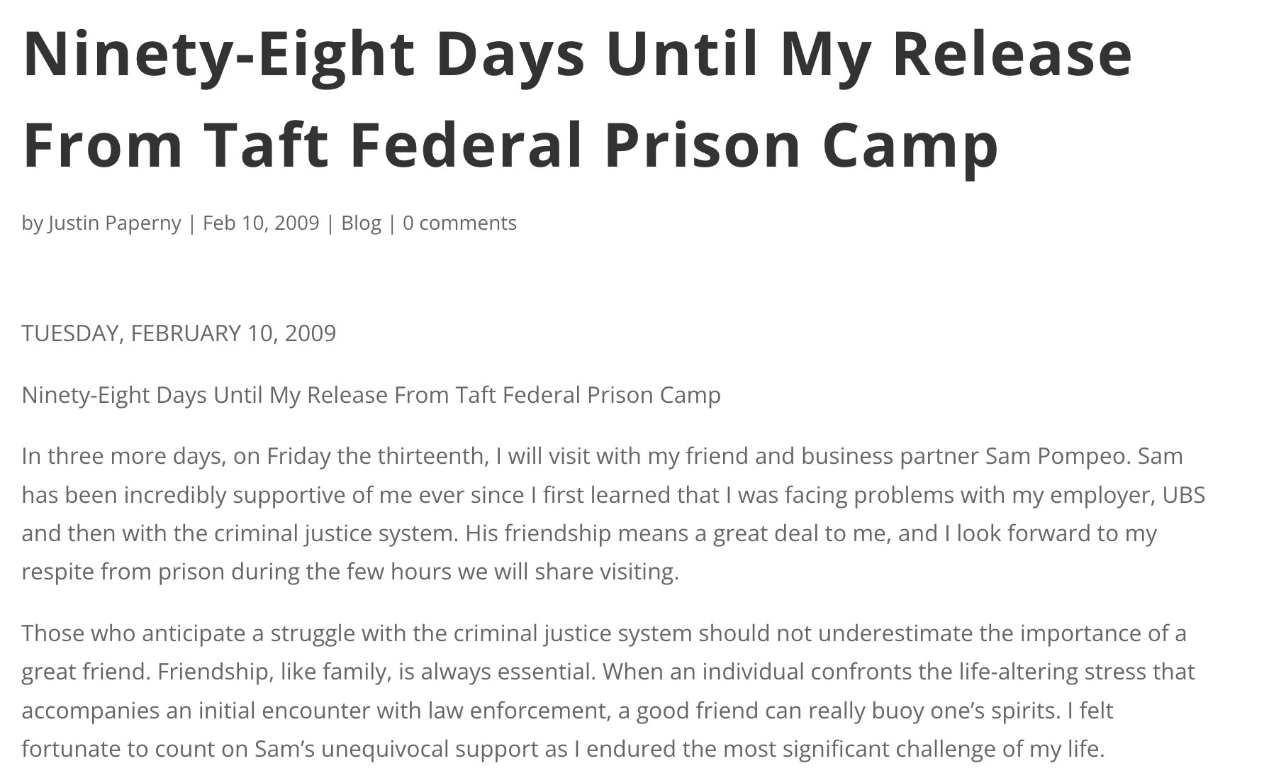 When I was fired from UBS on January 16th, 2005, I lost a lot of friends. Some people were polite about it. Others disappeared. I didn’t blame them. Soon I would be investigated. And in time, I was going to prison. People protect their own reputations. They step back. That’s how it usually goes.